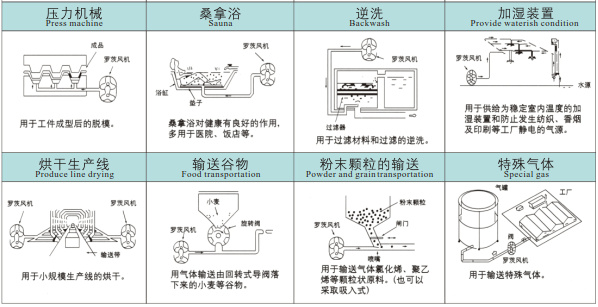 | Features | 1. Helical type timing gears for smooth operation 2. Compact, flexibility in installation gives users more choices. 3. Integral structure of impeller and shaft avoiding shortcomings of the split structure blower 4. Adopt imported oil seals made from fluoric rubber with great wear resistance and high-temperature resistance. 5. Low noise, low vibration and energy consumption. |
